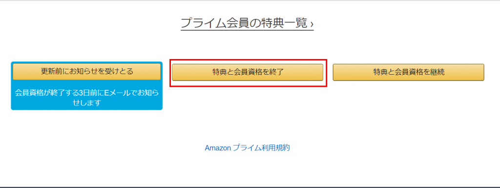 画面左下「プライム会員情報の管理」の「会員資格を終了する(特典を終了する)」を