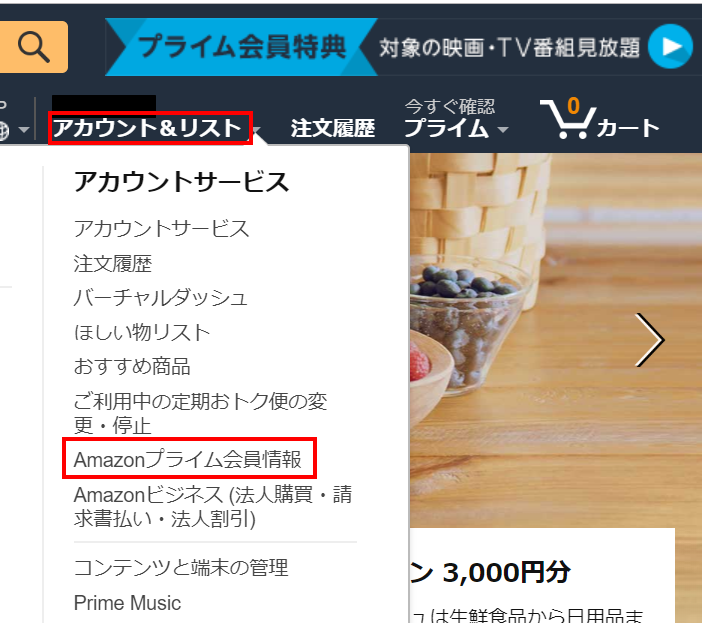「アカウント&リスト」→「Amazonプライム会員情報」