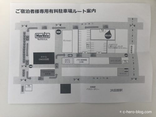 なお、ホテル駐車場への行き方は、以下の写真を参考にしてください(用紙は、ホテルフロントでもらったものです。